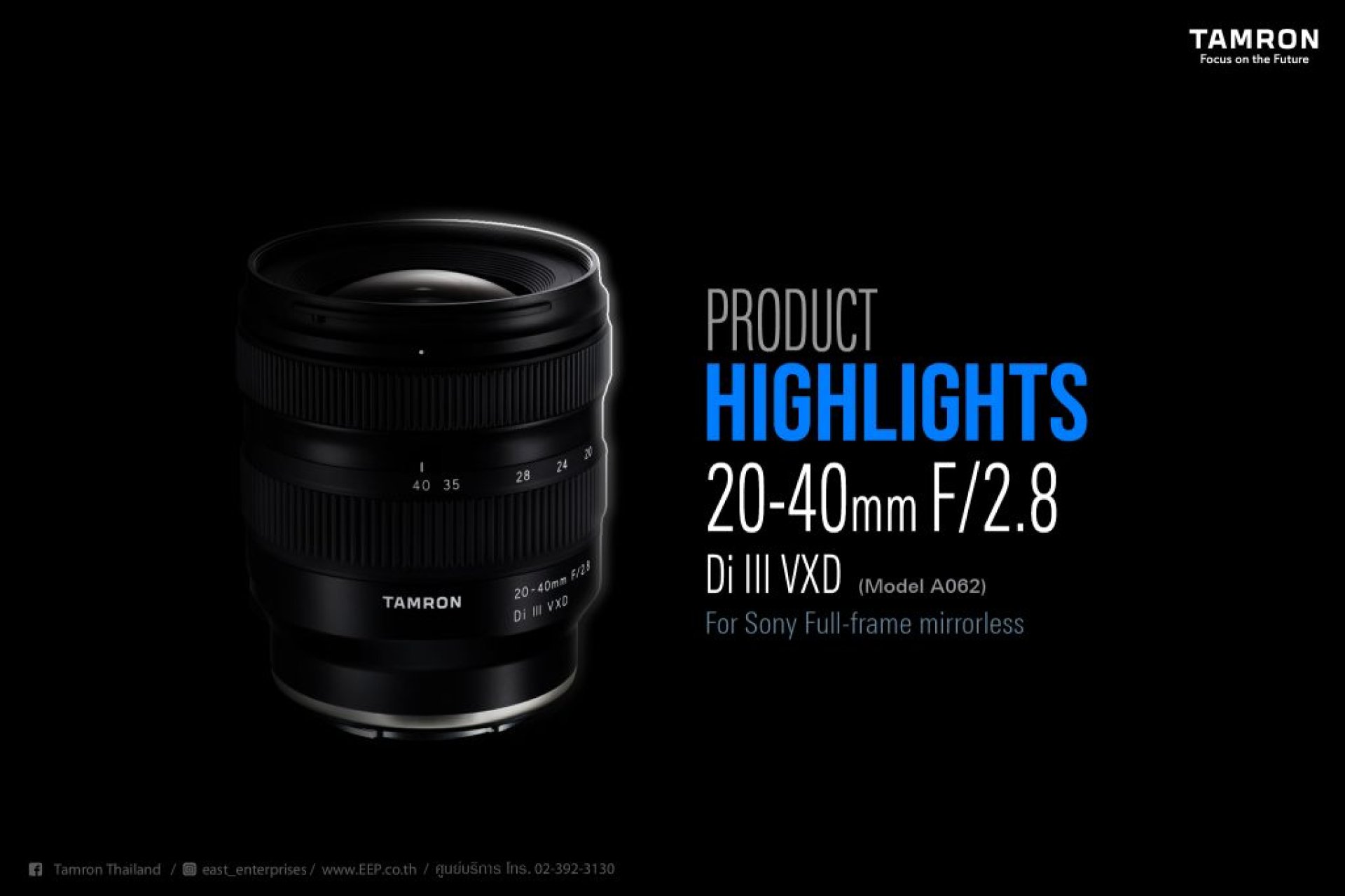 TAMRON พัฒนาเลนส์ซูมมาตรฐานใหม่สำหรับกล้องมิลเลอร์เลสฟูลเฟรมของ Sony E-mount ให้กับนักถ่ายภาพที่ชื่นชอบการถ่ายภาพนิ่งและภาพวิดีโอที่ต้องการใช้เลนส์ทางยาวโฟกัสกว้าง ไล่ไปจนถึงทางยาวโฟกัสระยะมาตรฐานในขนาดที่เล็ก และน้ำหนักเบา เพื่อให้สอดคล้องกับไลฟ์สไตล์ของการนำเสนอภาพในโลกออนไลน์คนรุ่นใหม่ Tamron 20-40mm F/2.8 Di III VXD (Model A062) จึงถือกำเนิดขึ้นอีกครั้งพร้อมเทคโนโลยีใหม่ล่าสุด!!!
