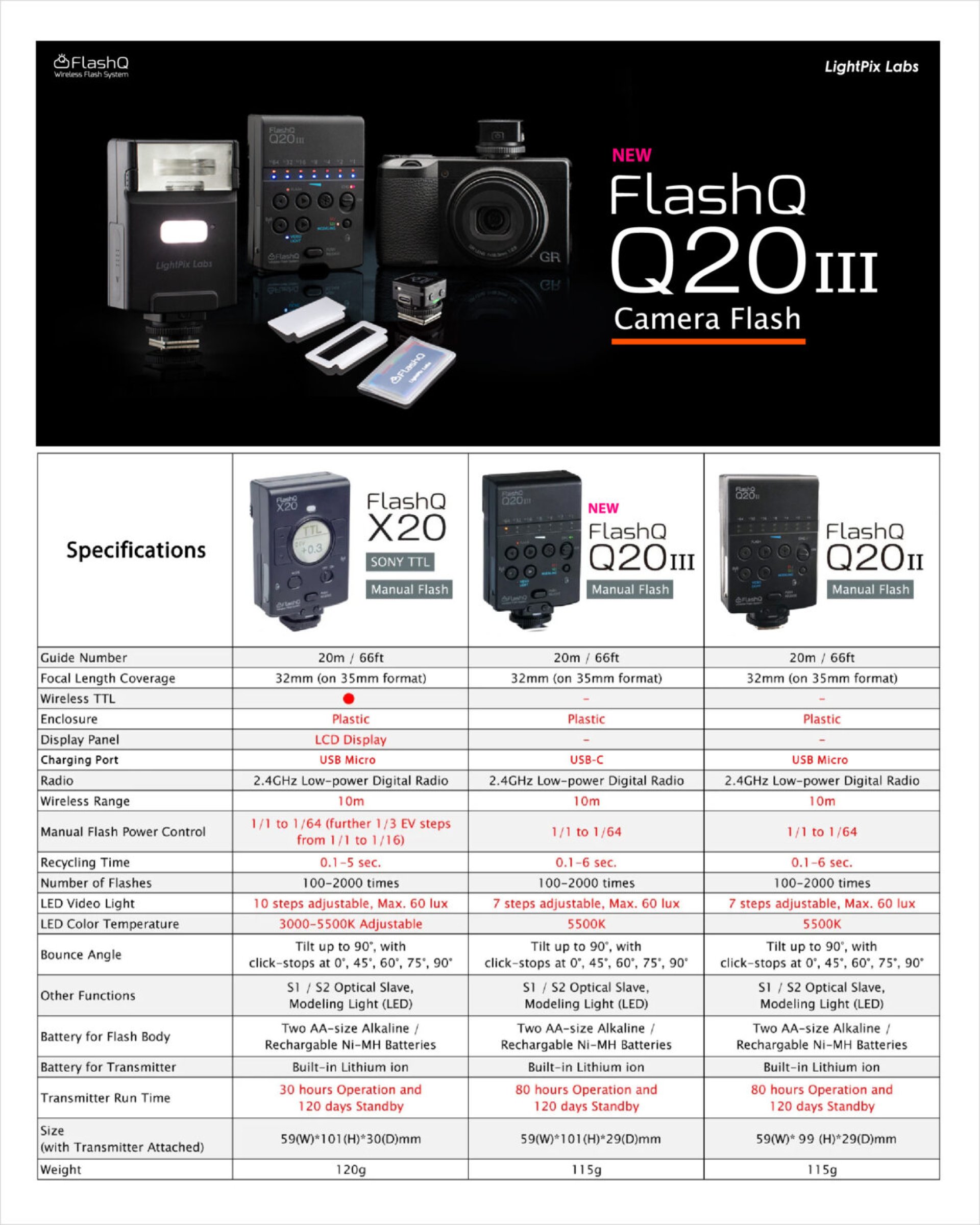 ในแต่ละรุ่นจะมีกำลังไฟที่ GN. 20 ขนาดภายนอกไม่แตกต่างกัน แต่หลักๆ จะเป็นเรื่องระบบการทำงานแบบแมนนวล ใน 2 รุ่น คือ Q20 II และ Q20 III ส่วนรุ่น X20 จะมีการทำงานระบบ TTL รองรับกล้องคอมแพค (Compact) และ Mirrorless หลากหลายรุ่นจาก Sony (และมีแบบที่ผลิตสำหรับ Fujifilm ด้วย) แต่ในรุ่น X20 ก็มีโหมดแมนนวลให้เลือกใช้เช่นกัน ..จุดเด่นในเรื่องแยกตัวแฟลชออกจากบอดี้ แล้วใช้งานแบบไร้สาย (Wireless Flash) เป็นคุณสมบัติที่นักถ่ายภาพชื่นชอบอย่างมาก เพื่อสร้างมิติให้กับภาพทั้งในการช่วยเปิดเงา หรือจะเป็นแสงหลักเลยก็ได้ เมื่อนำไปถ่ายภาพบุคคล อาหาร ดอกไม้ แมลง คุณสามารถวางตำแหน่งทิศทางแสงได้ตามใจต้องการ สามารถเพิ่มความนุ่มนวลด้วยแผ่น Diffuser หรือจะย้อมสีด้วยแผ่นเจลสี (มี 6 สี และ 7 สีสำหรับรุ่น Q20 III) อุปกรณ์เสริมที่ให้มาพร้อมในกล่อง