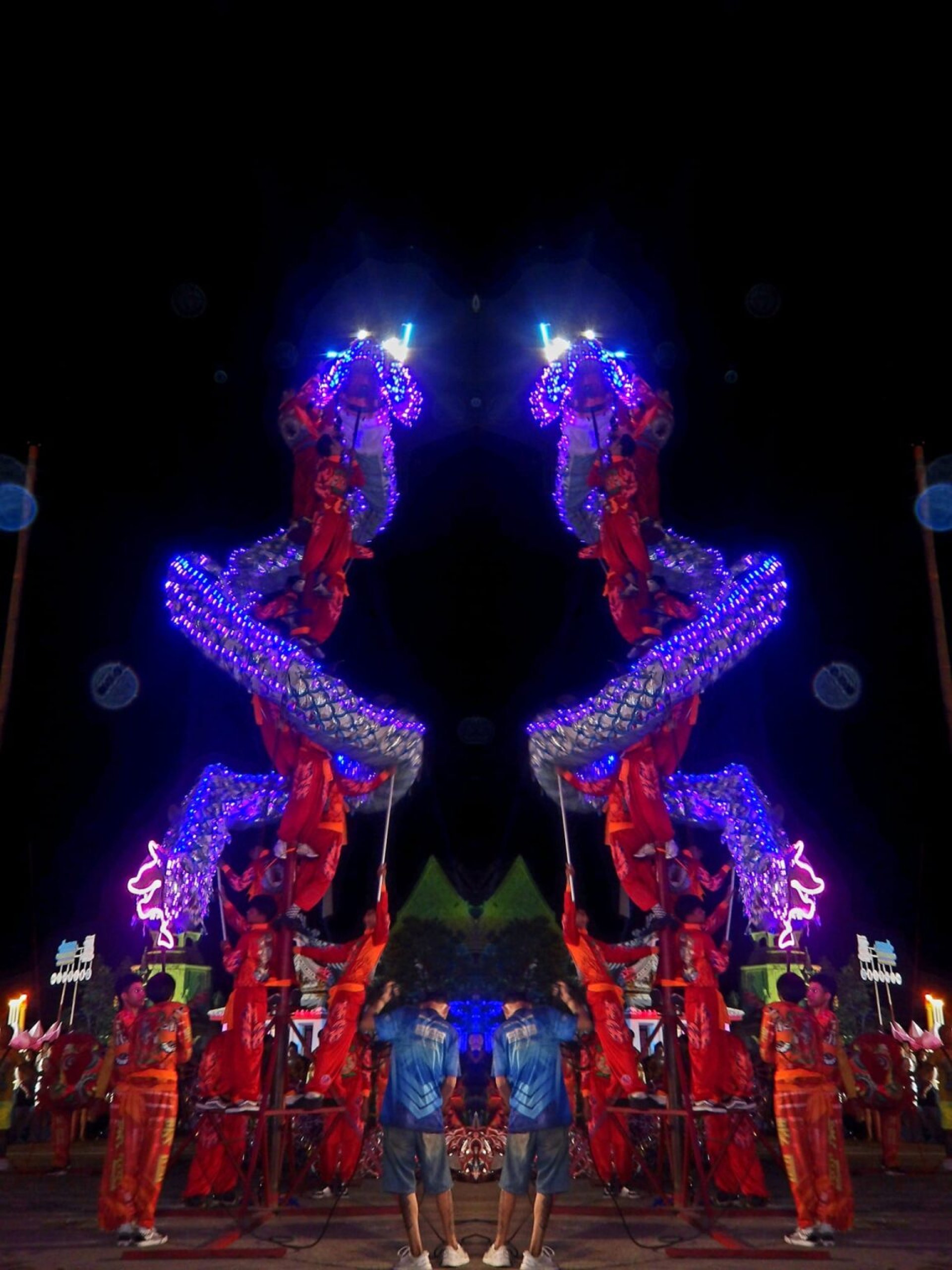 พอจบพลุภายใน 5 นาที ก็เดินกลับมาลานหน้าเวที กำลังจะมีเชิดสิงโต กับเชิดมังกร 2 ตัว ได้โอกาสลองเทคนิคSlow sync flash, Reflection ก็พอถูๆ ไถๆ เพราะคุมค่าต่างๆ ยากกว่าใช้กล้องMirrorless ที่ควบคุมได้แบบ100% ภาพที่ได้ก็ไม่ขี้เหร่นะ ..แต่เรายังไม่ชินกับจังหวะกล้อง เวลายิงแฟลชต้องรอแป๊บนึง..ขัดใจหน่อย บางซีนแฟลชมันดันเบายิงไม่ถึง 555 แต่อย่าลืมว่ากล้องPentax WG-1000 มันตัวไม่ถึงหมื่นนะได้ประมาณนี้ก็สุขใจแล้ว