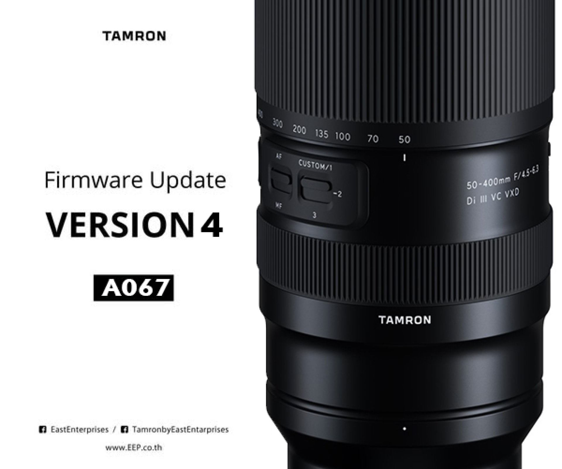 วันที่ 21 มกราคม ค.ศ. 2025, เมืองไซตามะ ประเทศญี่ปุ่น - บริษัท Tamron จำกัด โดยประธาน และประธานกรรมการบริหาร คุณโชโก ซากุราบะ ได้ประกาศเปิดตัวเฟิร์มแวร์ใหม่สำหรับเลนส์รุ่น 50-400mm F/4.5-6.3 Di III VC VXD (Model A067) ในระบบ SONY E-Mount