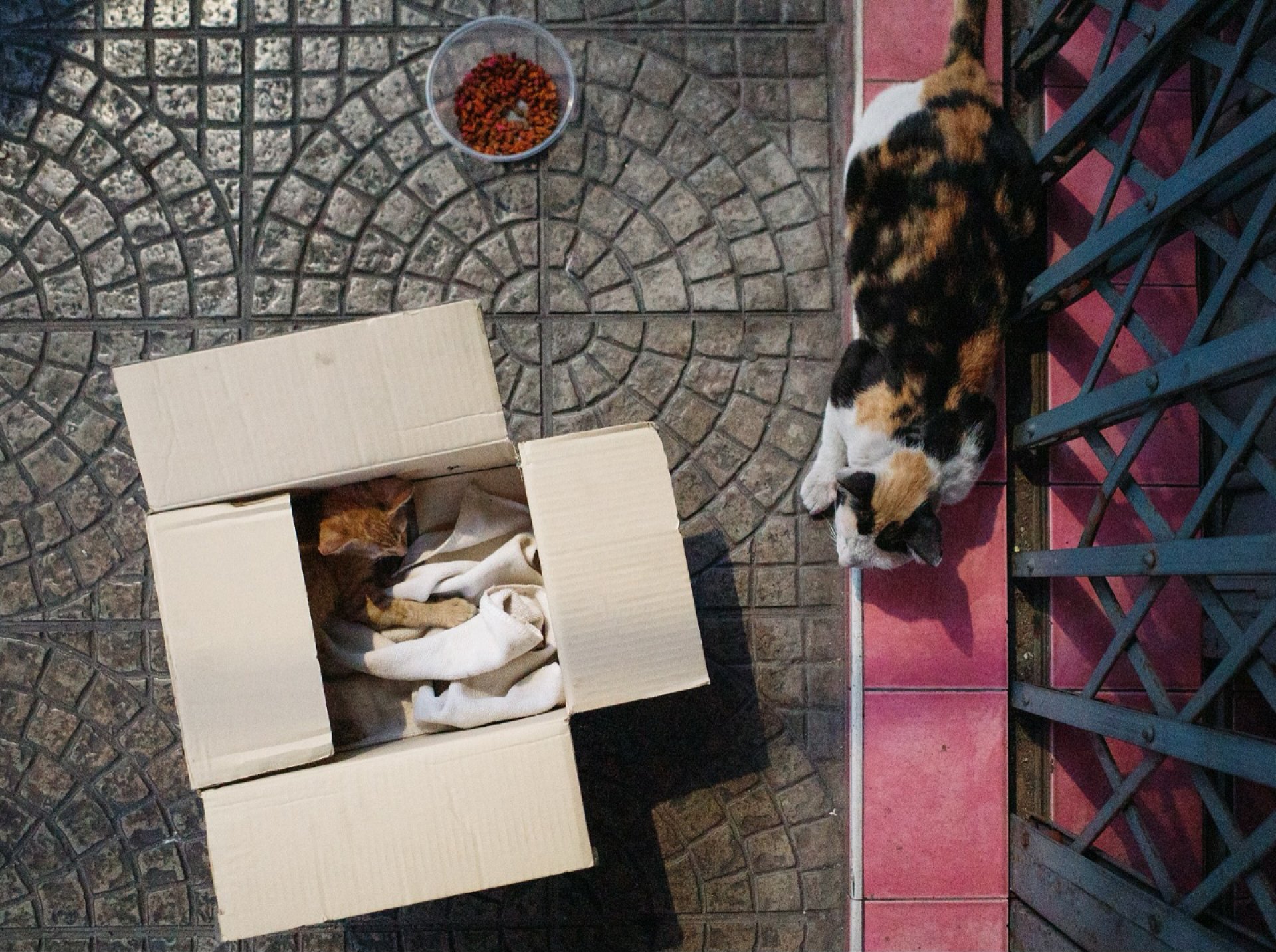 แม่แมวนอนเฝ้า ลูกแมวส้มที่ไม่สบาย มีคนที่อยู่แถวนี้เอาแมวส้มใส่กล่องไว้ป้องกันอันตรายที่อาจจะเกิดจากแมวหรือสุนัขตัวอื่นมา