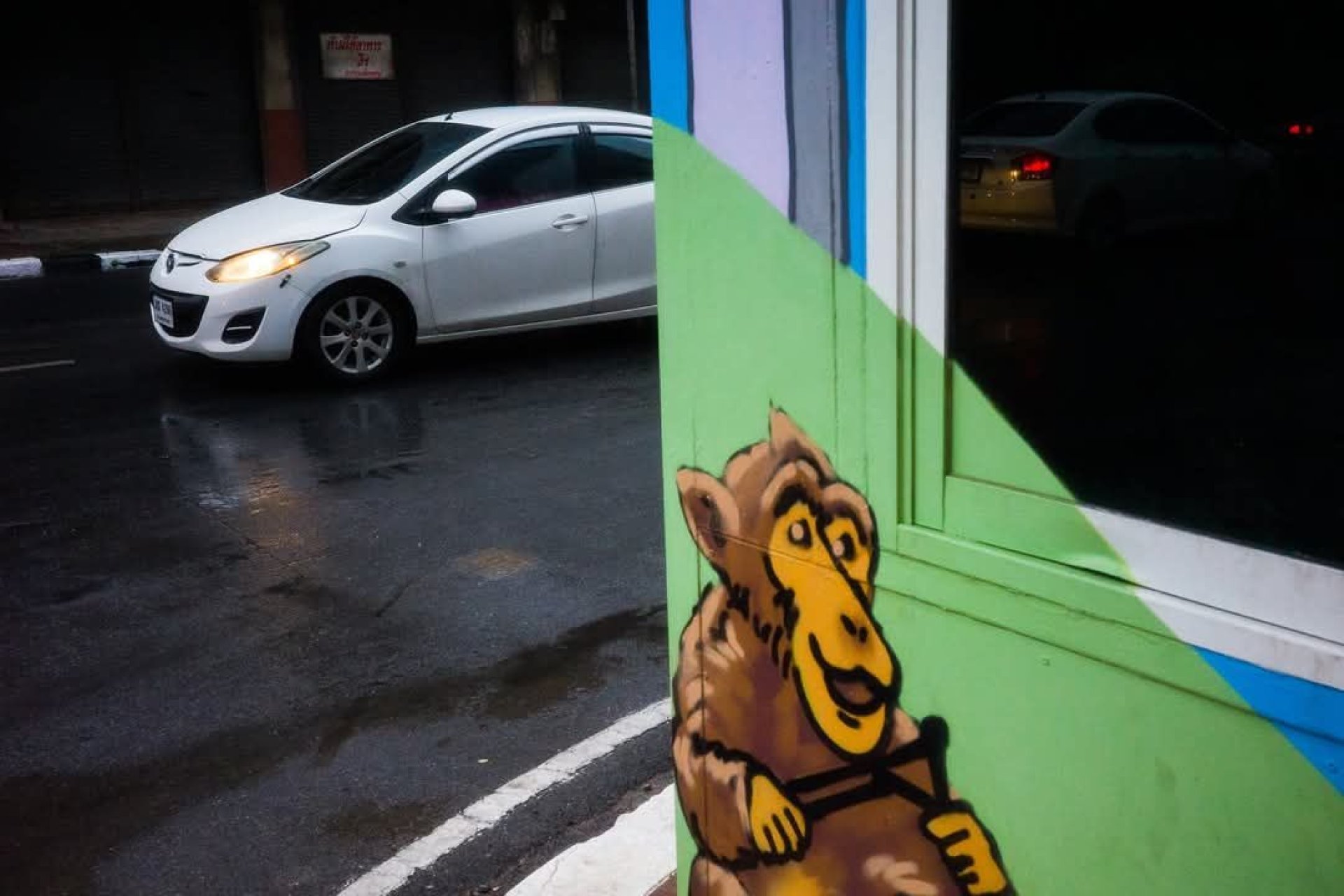 ตอนแสงใกล้จะหมดเราสะดุดเห็นตู้จราจร มีภาพวาดรูปลิง แล้วเห็นเส้นน่าสนใจเลยพยายามวางให้ตรงกับหลังคารถบนถนนที่ผ่านไปมา ถือว่าเอาตัวรอดได้อีกวันครับ 5555